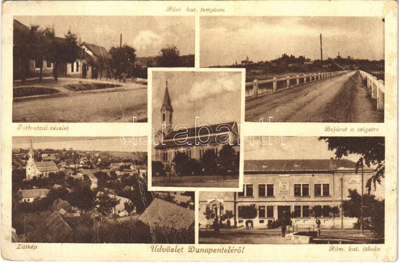1943 Dunaújváros, Dunapentele, Sztálinváros; Tóth utca, Római katolikus templom, bejárat a szigetre, látkép, Római katolikus iskola (fa)