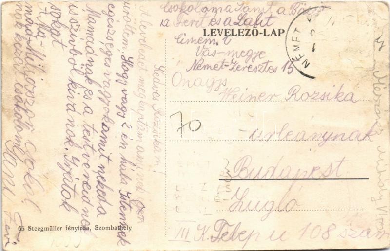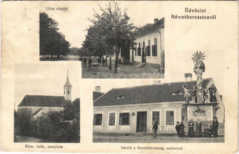 Németkeresztes (Vaskeresztes), utca, Római katolikus templom, iskola, Szentháromság szobor. Steegmüller fényirda (Rb)