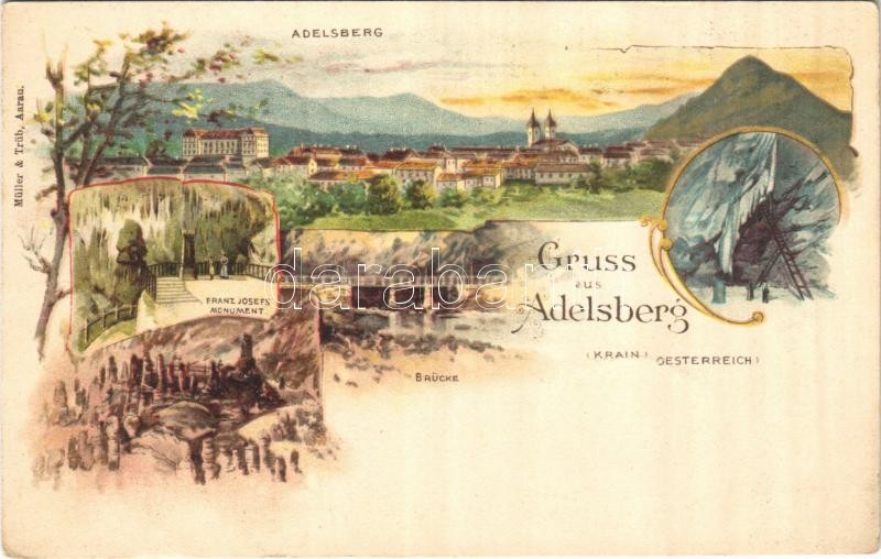Postojna, Adelsberg (Krain); Brücke, Franz Josefs Monument / cave interior, statue, bridge. Müller & Trüb Art Nouveau, floral, litho