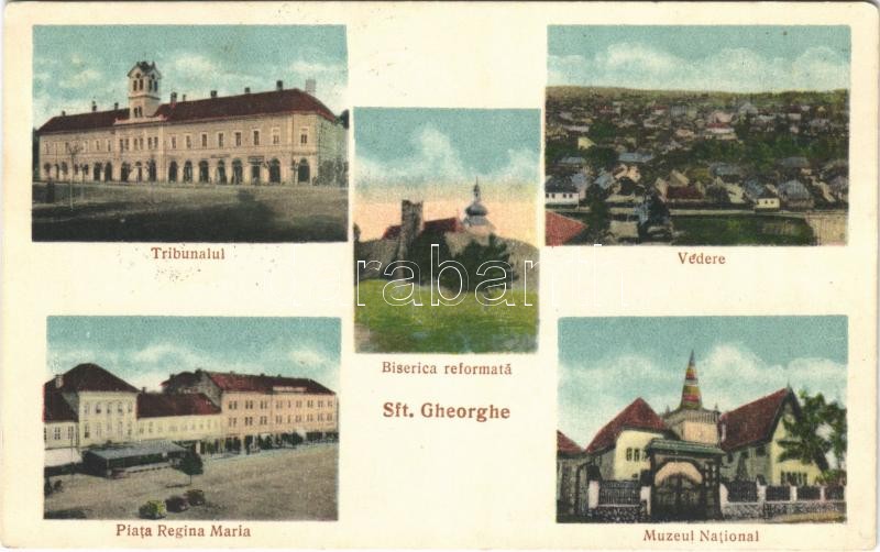 Description: 1940 Sepsiszentgyörgy, Sfantu Gheorghe; törvényszék, Mária királyné tér, Nemzeti múzeum, látkép, református templom / court, square, museum, Calvinist church + "1940 Sepsiszentgyörgy visszatért" So. Stpl