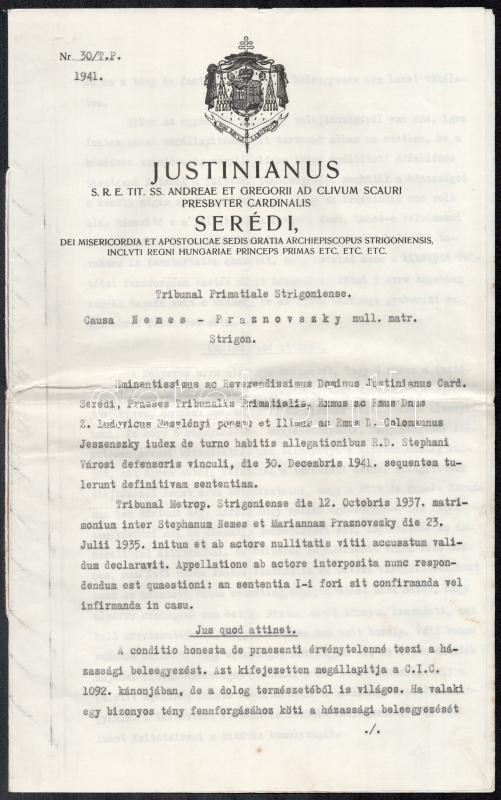 1941 Serédi Jusztinián (1884-1945) hercegprímás gépelt egyházi irata, ...