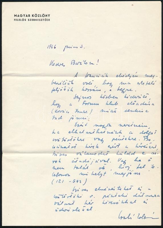 1946 Szabó Zoltán (1912-1984) Baumgarten-díjas író, falukutató, publicista, szerkesztő, a Magyar Közlöny szerkesztőjének saját kézzel írt levele Szekeres György (1914-1973) újságíró, műfordító (,később az Európa Kiadó főszerkesztője), részére, fejléces papíron, aláírással.