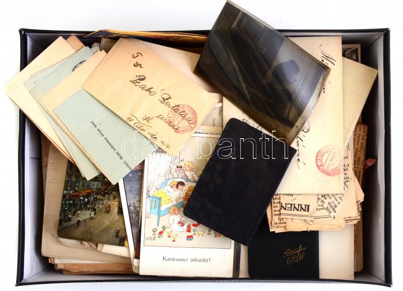 cca 1930 Cipősdoboznyi családi levelezés, képeslapok, iratok, levelek