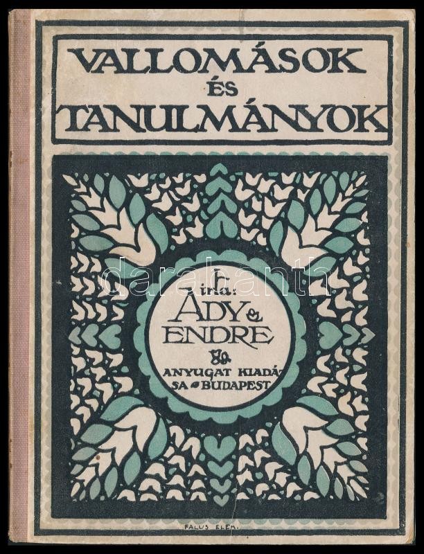 Description: Ady Endre: Vallomások és tanulmányok. Bp., 1918, Nyugat,(Világosság-ny.), 101 p.+3 p. A borító illusztrációja Falus Elek (1883-1950) munkája. Kiadói félvászon-kötésben, a címlapon a Pallas felülragasztásával ("Budapest, Pallas Irodalmi és Nyomdai Részvénytársaság 1918"), ex libris-szel.