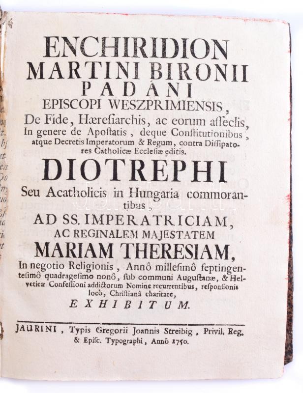 [Padányi Biró Márton (1693-1762)]: Enchiridion Martini Bironii Padáni Episcopi Weszprimiensis, de Fide, Haeresiarchis, ac eorum asseclis, In genere de Apostatis, deque Constitutionibus, atque decretis Imperatorum & Regum, contra Dissipatores Catholicae Ecclesiae Editis. Diotrephi seu Acatholicis in Hungaria commorantibus, ad S.S. Imperatriciam, ac Reginalem Majestatem Mariam Theresiam,.... Exhibitum. Jaurini [Győr], 1750, Typis Gregorii Joannies Streibig, 6 sztl. lev. +208 p.+ 8 sztl. lev. Latin nyelven. Egyetlen kiadás. A művet maga korában Mária Terézia betiltotta túlzott protestáns ellenessége miatt. Korabeli kissé kopott kartonált papírkötésben, festett lapélekkel, hiányzó címképpel, egyébként jó állapotban.
