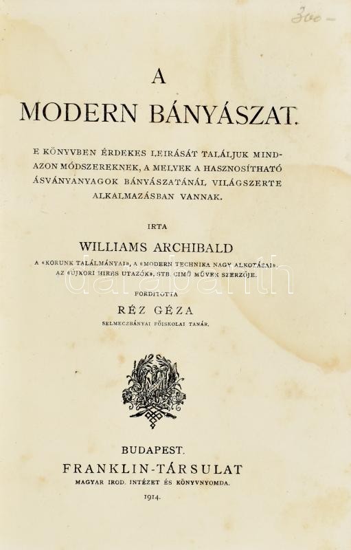 https://www.darabanth.com/en/386-Online-auction/386.0/Books/Books-Technics~1000012/Williams-Archibald-Modern-banyaszat-Bp-1914-Franklin-Kiadoi-erosen-foltos-egeszvaszon-k~II2314428