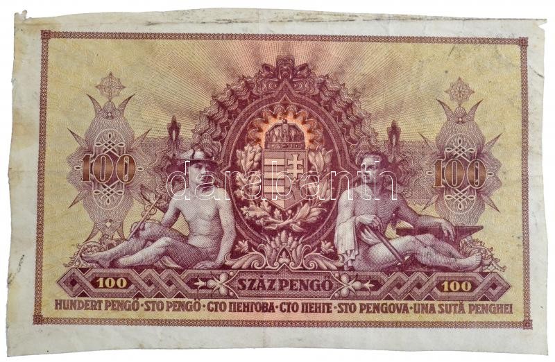 Description: 1943. 100P "Szálasi-kiadás" kiadatlan, sor- és sorozatszám nélkül, ívből kivágva T:III szélen kis szakadás, fo. Hungary 1943. 100 Pengő "Szálasi edition" officialy unissued, without serial number, cut from sheet C:F small tear on the edge, spotted Adamo SPT18v