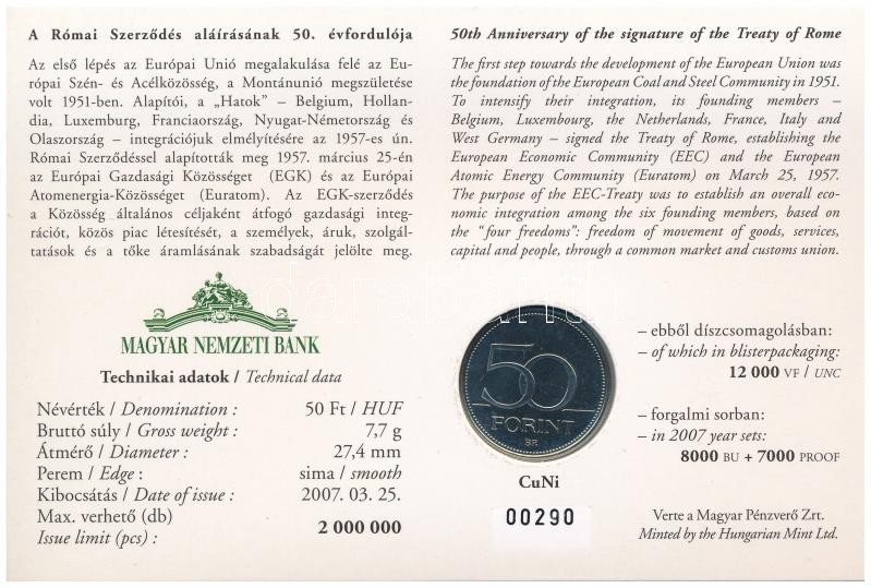 2007. 50Ft "Római Szerződés" elsőnapi veret sorszámozott emléklapon, "00290" sorszámmal T:1