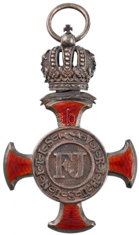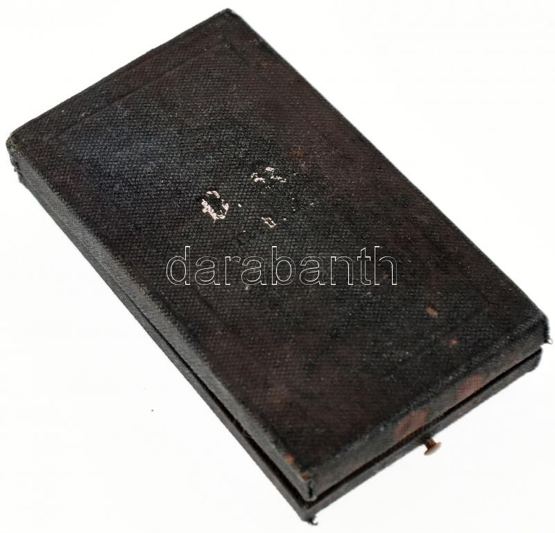 1915. "Koronás Ezüst Érdemkereszt" karikán jelzett Ag kitüntetés mellszalag nélkül, függesztőkarikán fémjellel és "V MAYERS SÖHNE IN WIEN" gyártói jelzéssel, eredeti, sérült "V. MAYER'S SÖHNE" tokban T:2,2- zománchiba Hungary 1915. "Silver Cross of Merit with Crown" hallmarked Ag decoration without ribbon, on suspension ring with "V MAYERS SÖHNE IN WIEN" makers mark, in original, damaged "V. MAYER'S SÖHNE" case C:XF,VF enamel error NMK 222/223.