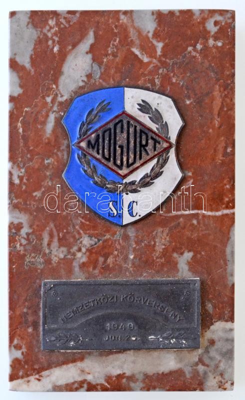 Description: 1949. "MOGÜRT SC (Magyar Országos Gépkocsi Üzemi Részvénytársaság Sport Clubja)" zománcozott Br címerével és "NEMZETKÖZI KÖRVERSENY 1949.JÚN.26." feliratú Br táblával, hátoldalán "BOCZÁN KÁROLY BUDAPEST VIII. CSOKONAI U. 8." feliratú matricával, márványtalapzaton (86x139x20mm) T:2-