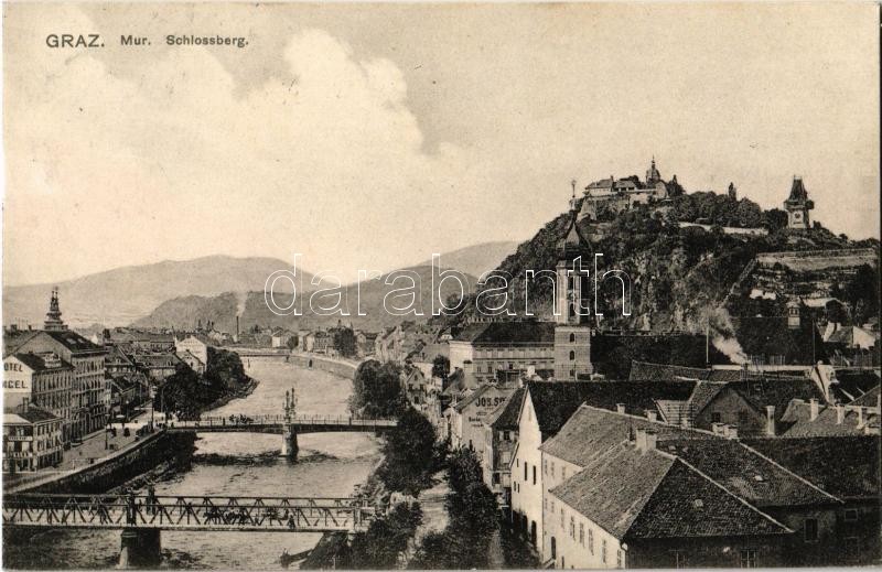 1907 Graz, Mur, Schlossberg / castle hill, bridge, hotel. L. Strohschn...