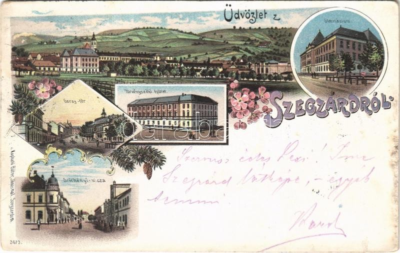 1899 Szekszárd, Garay tér, Törvényszéki épület, Gimnázium, Széchenyi utca. Kapható Báter Jánosnál, floral, Art Nouveau, litho (r)