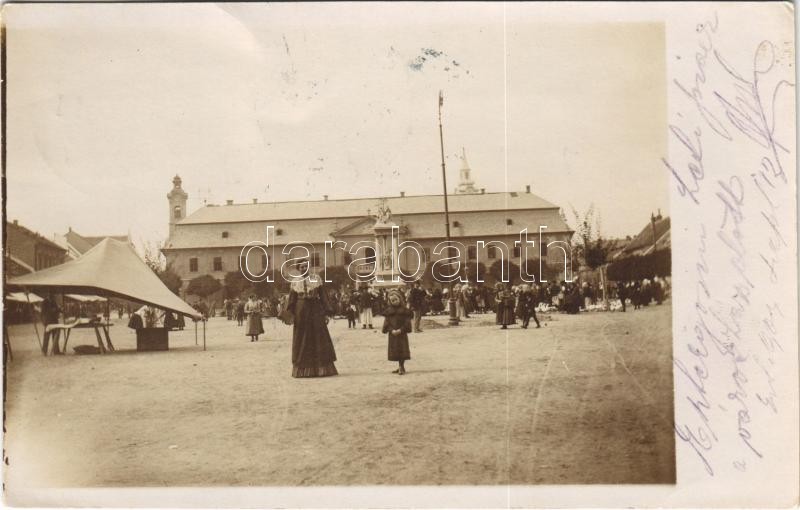 1904 Esztergom, Fő tér, városháza, Szentháromság szobor, piac. photo