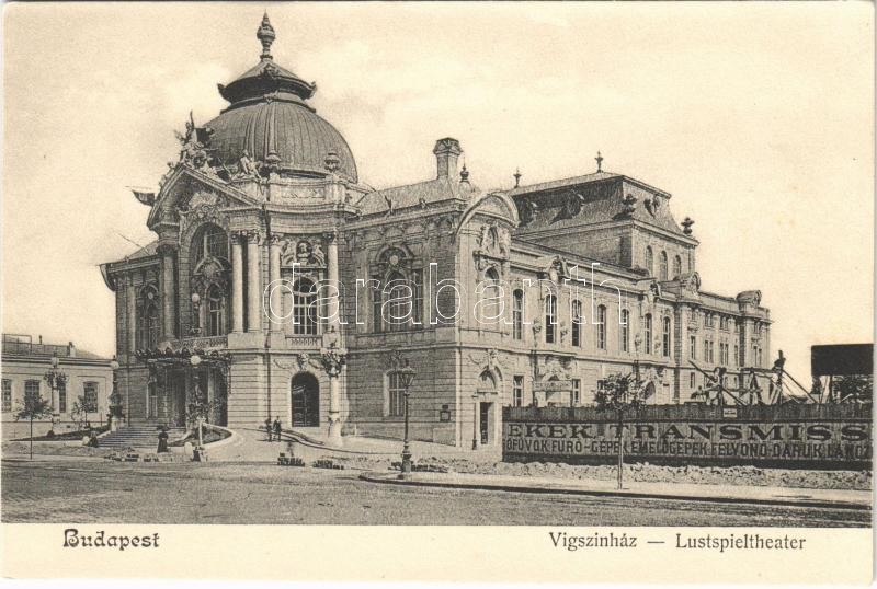 Description: Budapest XIII. Vígszínház, építkezés, fúrógépek, emelőgépek és felvonó daruk reklámja. A színház 1896-ban készült el, körülötte később épült többemeletes épületek még hiányoznak