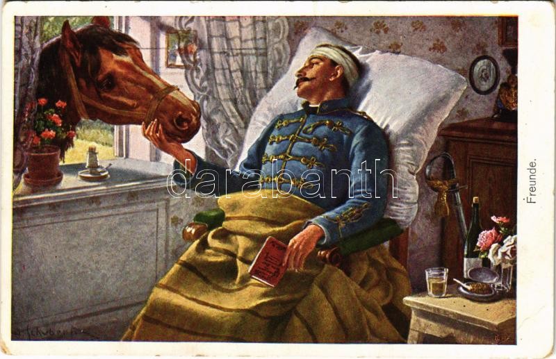 1915 Freunde / WWI Austro-Hungarian K.u.K. military art postcard, injured soldier with horse. W.R.B. & Co. Nr. 156. s: Heinrich Schubert (EB)