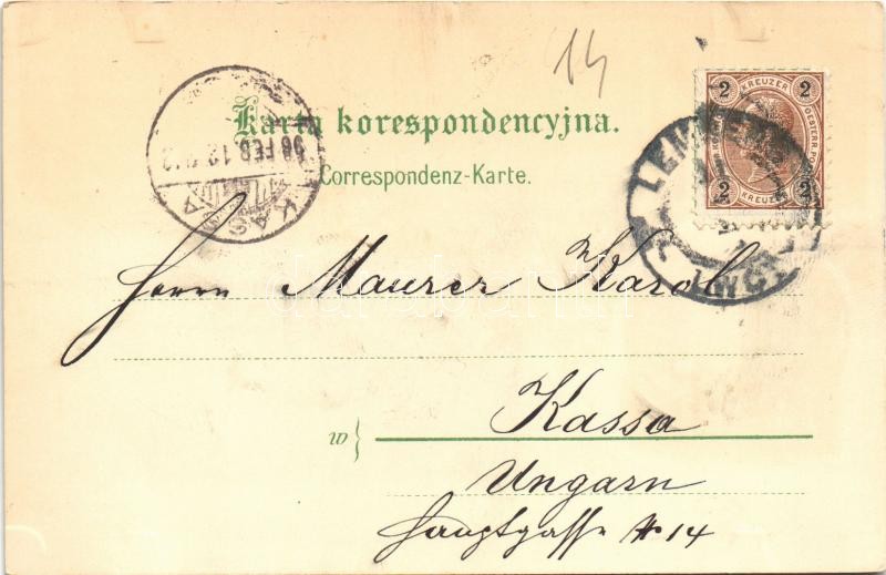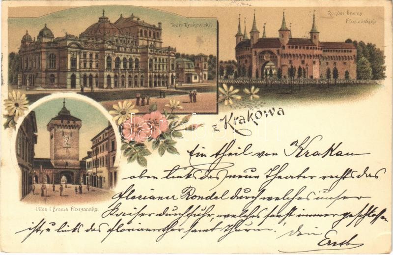 Description: 1896 (Vorläufer!!!) Kraków, Teatr Krakowski, Rondel bramy Florianskiej, Ulica i Brama Floryanska / theatre, St. Florian's Gate, barbican, street view. Art Nouveau, floral, litho