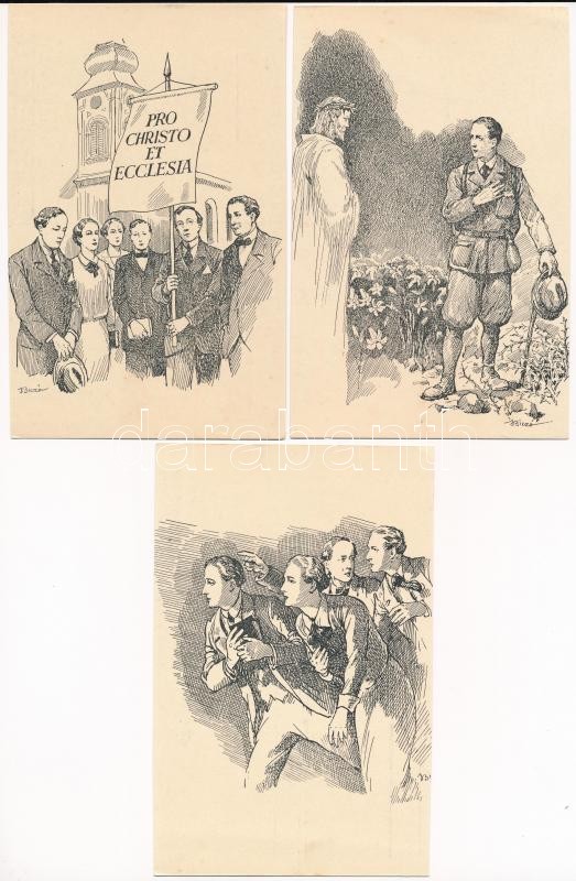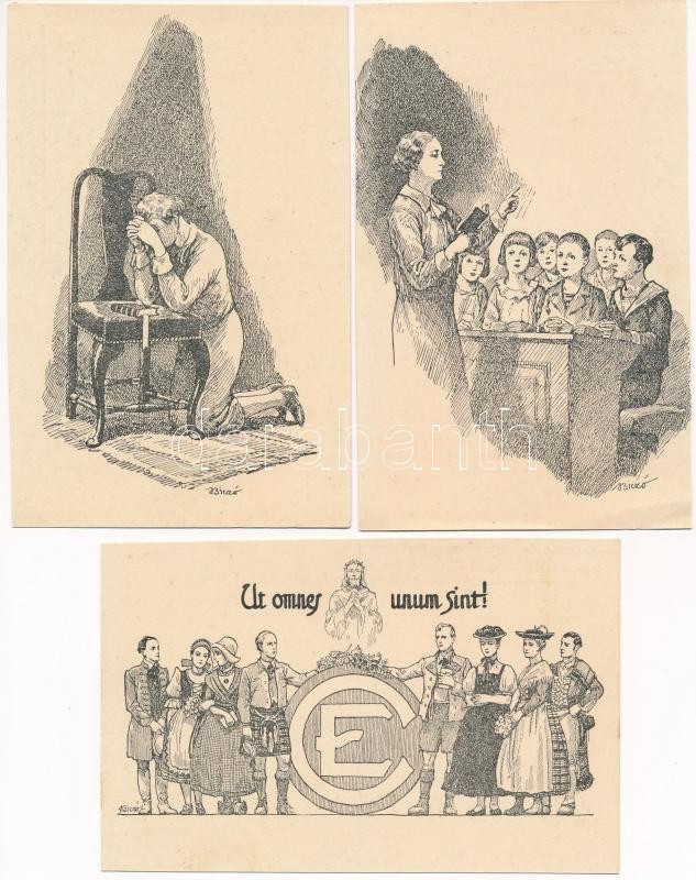Description: 6 db RÉGI magyar vallásos grafikai képeslap: IX. Keresztyén Szövetségi Világkonferencia Budapesten 1935., Biczó szignóval / 6 pre-1945 Hungarian religious graphic postcards by Biczó