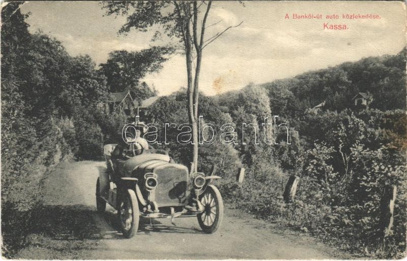 1912 Kassa, Kosice; A Bankói út autó közlekedése / road to Bankov, lad...