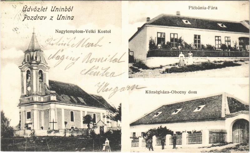 1914 Nagyúny, Unin, Unín; Nagytemplom, plébánia, községháza. Friedrich Wechsler kiadása / Velki Kostol, Fara, Obecny dom / church, rectory, town hall
