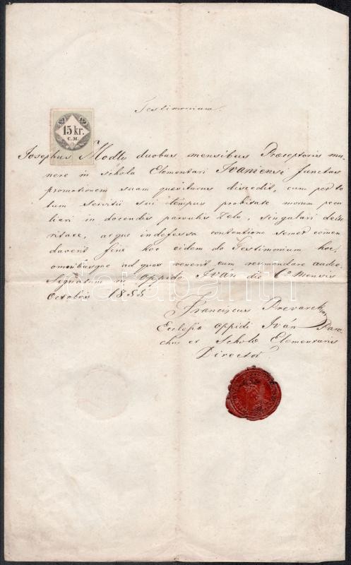 1855 Testimonium 15 kr C.M. okmánybélyeggel, viaszpecséttel