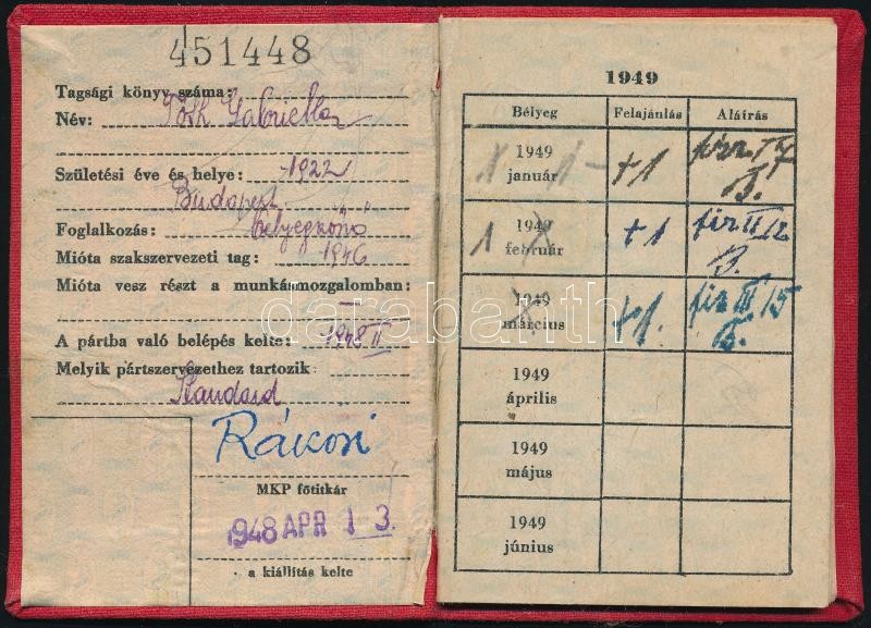 1948 Magyar Kommunista Párt tagsági könyve, Rákosi Mátyás pecsételt al...