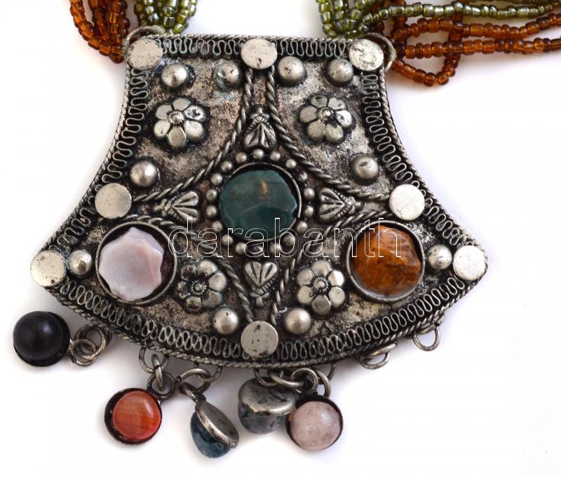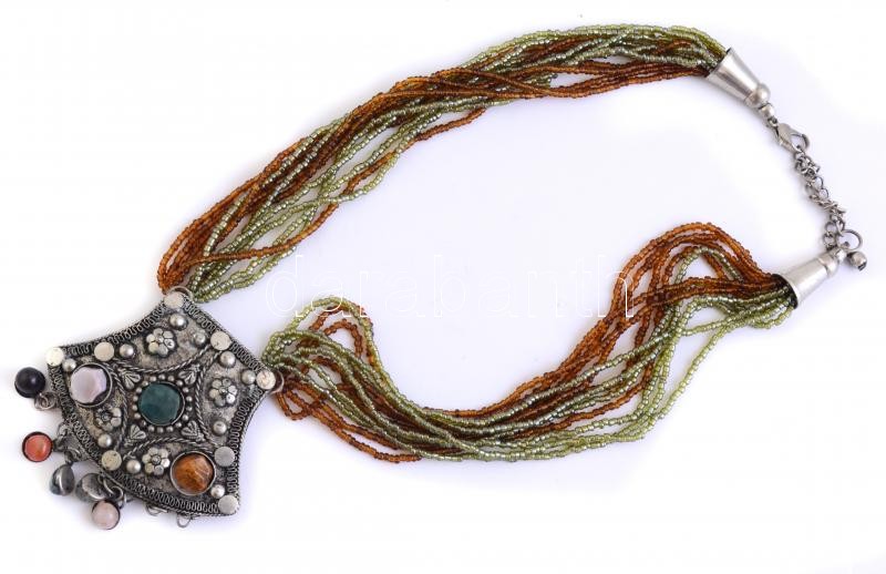 Fűzött gyöngy nyaklánc ásványokkal díszített medálrésszel, h: 44 cm