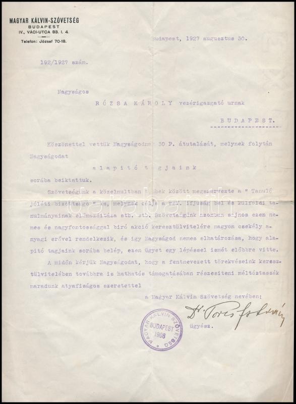 1927 Magyar Kálvin Szövetség levele Rózsa Károly vezérigazgatónak, amely szerint alapító tagjai sorába beiktatták. 1 géppel írt oldal fejléces papíron, Magyar Kálvin Szövetség bélyegzőjével, hajtásnyommal, javított szakadással..