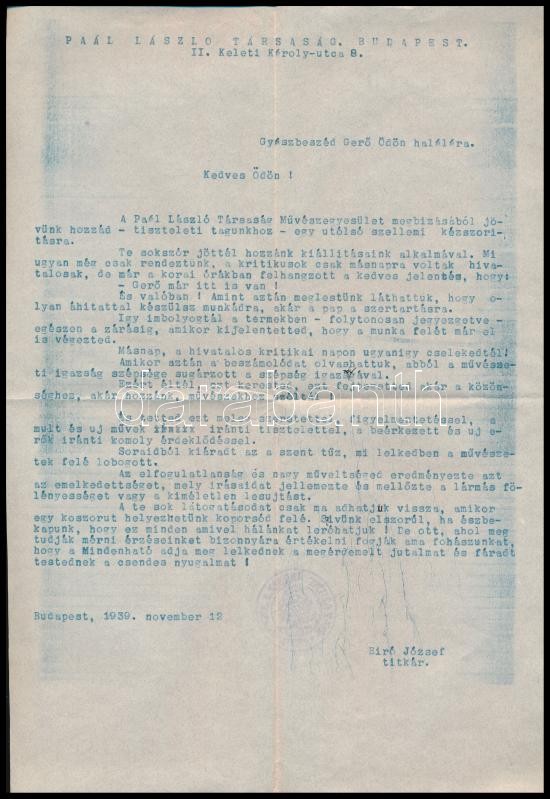 1939. november 12, Bíró József (1887-1975) festőművész, a Paál László Társaság titkára gyászbeszéde Gerő Ödön (1863-1939) műkritikus, a Paál László Társaság tiszteleti tagjának halálára. Felidézi Gerő munkásságát: " (...) Te sokszor jöttél hozzánk kiállításaink alkalmával. Mi ugyan még csak rendeztünk, a kritikusok csak másnapra voltak hivatalosak, de már a korai órákban felhangzott a kedves jelentés, hogy. - Gerő már itt is van! (...)"1 géppel írt oldal, fejléces papíron, a Paál László Társaság bélyegzőjével, hajtásnyomokkal.