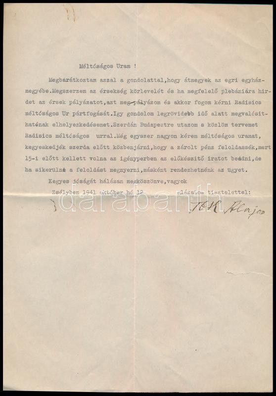 1941 Zsély, zsélyi plébános átnevezési kérelméről szóló levél