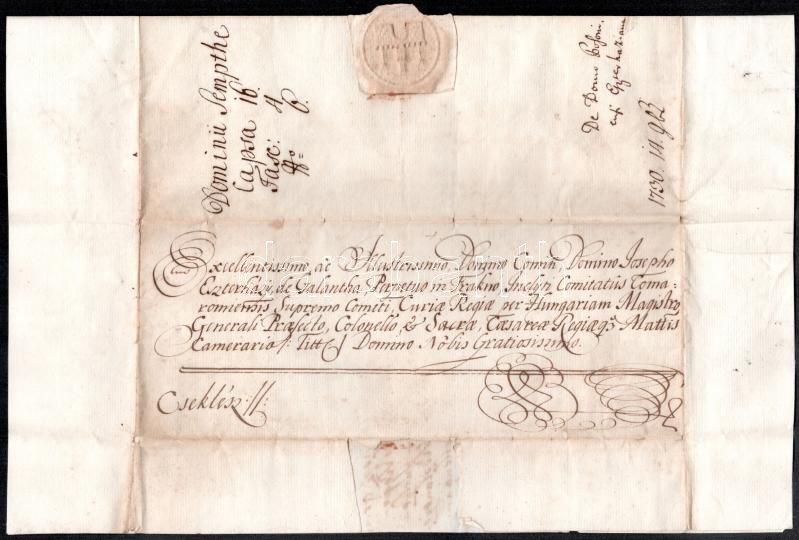 VÉDETT NO EXPORT 1730 A pozsonyi városbíró levele Esterházy József (1682-1748) tanácsos, komáromi főispán, későbbi országbíróhoz a folyó katonai évi hadiadó ügyében; papír latinul, külzetén Pozsony városi viaszpecséttel /