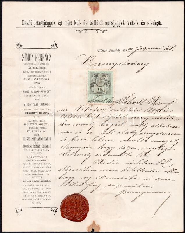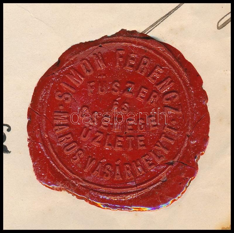 cca 1898 Marosvásárhely, fejléces levél, okmánybélyeggel, viaszpecséttel, hátulján hirdetéssel