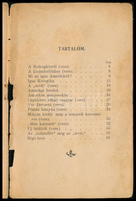 Berecz Károly: Bodrogközi rigólátta kalács. Amerikai és egyébb krónyikák. Sátoraljaújhely, 1901, "Zemplén"-ny., 61+2 p. Kiadói papírkötés, rossz állapotban, kopott, foltos, szakadozott borítóval, hiányos gerinccel.