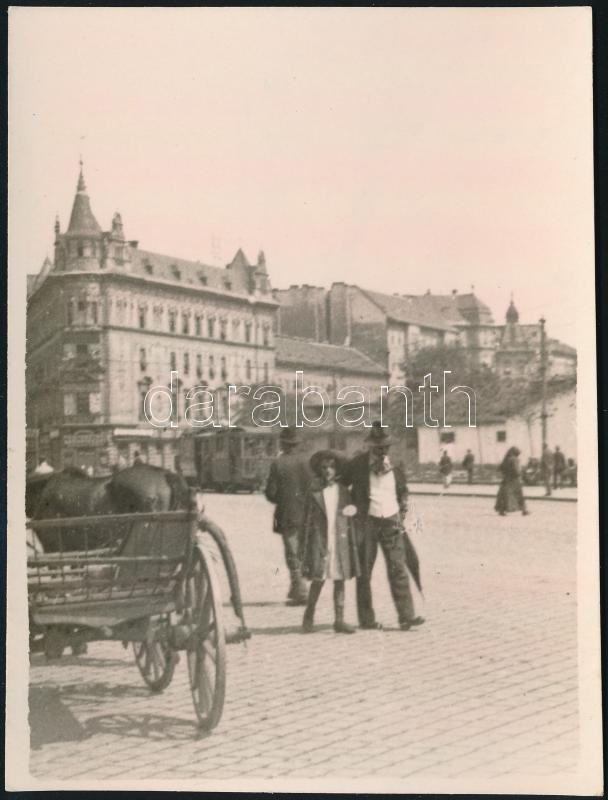 Description: cca 1910 Szekér és villamos a Keleti pályaudvar mellett, a Thököly út elején, jelzés nélküli vintage fotó Kerny István (1879-1963) budapesti fotóművész hagyatékából, 8,5x11,7 cm