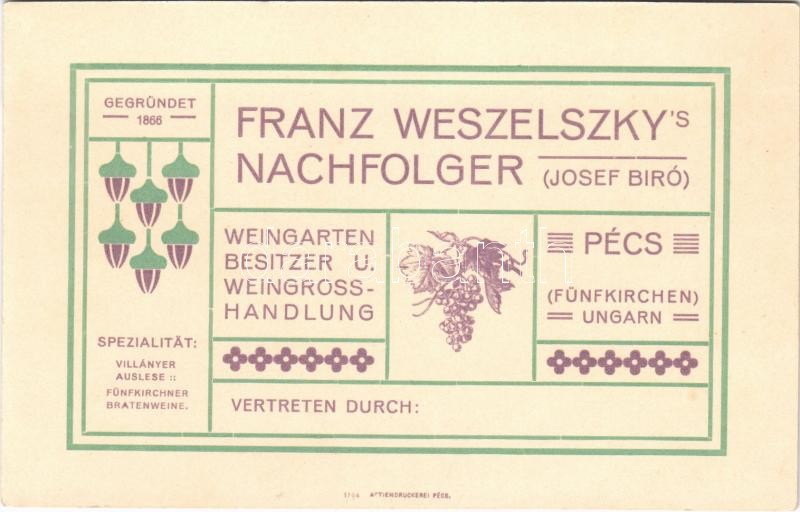 Pécs, Fünfkirchen; Franz Weszelszky's Nachfolger Josef Biró Weing... https://www.darabanth.com/en/387-Online-auction/387.0/Postcards/Advertisement~2000103/Pecs-Funfkirchen-Franz-Weszelszkys-Nachfolger-Josef-Biro-Weingarten-Besitzer-u-Weingrosshandl~II2317336
