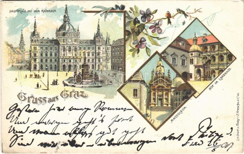 1897 (Vorläufer) Graz, Hauptplatz, Rathhaus, Mausoleum, Hof im Landhaus / main square, town hall, mausoleum, courtyard. E. Presuhn Art Nouveau, floral, litho (EB)