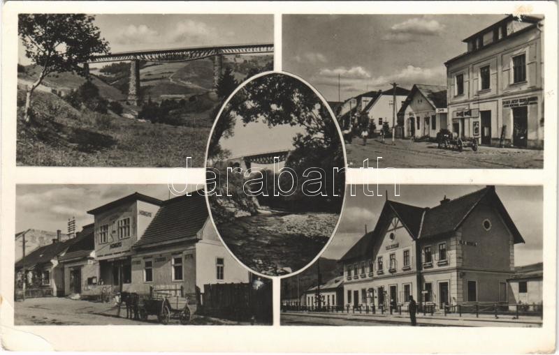 Volóc, Volovec, Volovets; Kisszolyvai viadukt, vasúti híd, Fő utca, Cikta üzlet, Szövetkezeti szálló, vasútállomás, létra / railway bridge, viaduct in Skotarska, main street with shops, hotel, railway station, ladder (EK)