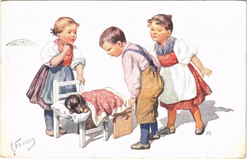 1912 Children art postcard, sleeping Dachshund dog. B.K.W.I. 46-4. s: K. Feiertag (EB)