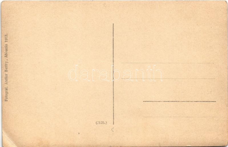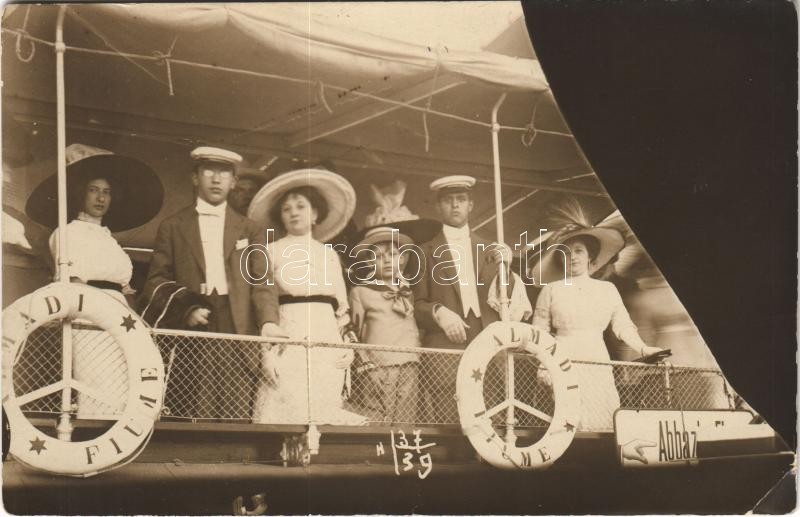 Description: 1912 Abbazia, Opatija; hajózás az "ALMÁDI" (Magyar Horvát Tengeri Gőzhajózási RT.) egycsavaros tengeri személyszállító gőzhajón (Salondampfer) / cruising on the "ALMÁDI" sea passenger steamship of the Hungarian-Croatian (Ungaro-Croata) steamship company. Fotograf. Atelier Betty (Abbazia) photo (EK)