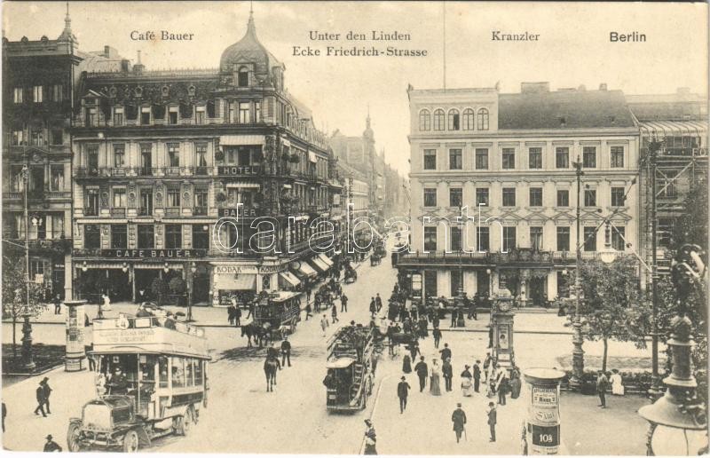 Description: 1909 Berlin, Unter den Linden Ecke Friedrich Strasse, Café Bauer, Kanzler / street view, autobus, horse-drawn omnibus, Hotel & Café Bauer, Kodak shop, advertising columns