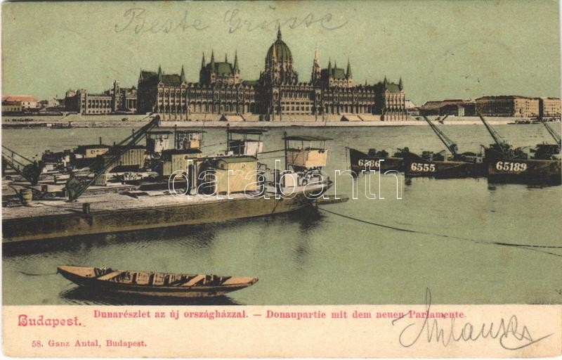 1902 Budapest V. Országház, Duna részlet az új országházzal, uszályok. Ganz Antal 58.