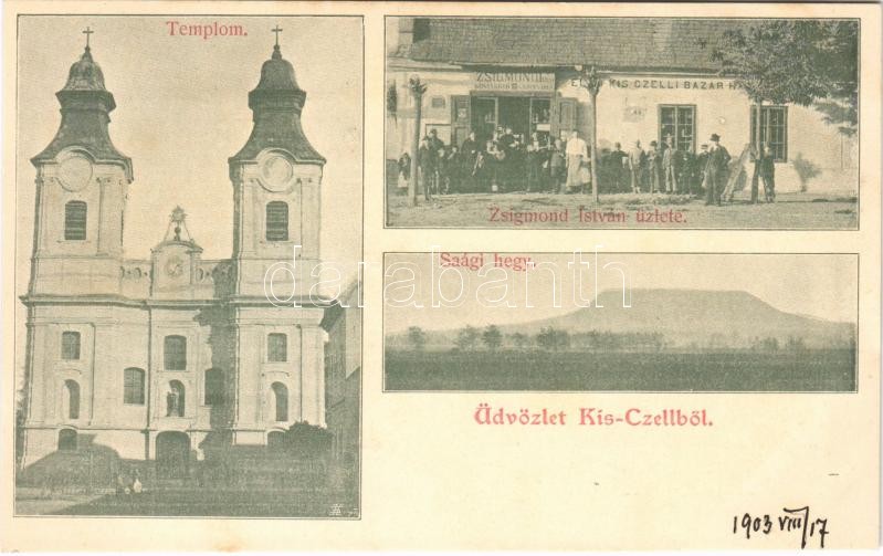 1903 Kiscell, Celldömölk; templom, Ssági hegy, Zsigmond István könyvkötő üzlete, Első Kis-Czelli Bazár ház