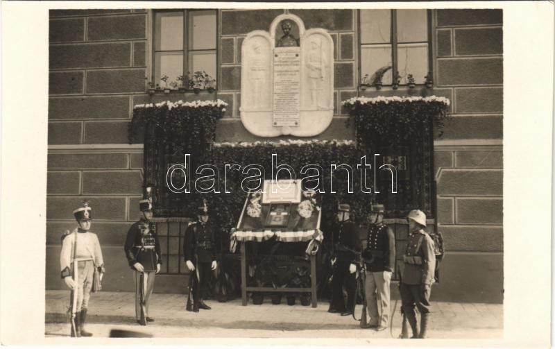 Description: Budapest VIII. Ludovika, "Ezt az emléket a M. ki.r Honvéd Ludovika Akadémia alapkőletételének évfordulójára állította a Magyar Hála", díszőrség. Schäffer Gy. fényképész, photo