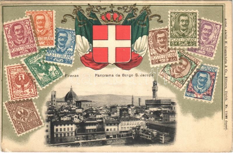 Firenze, Florence; Panorama da Borgo S. Jacopo. Artist. Atelier H. Guggenheim & Co. No. 11498. Emb. coat of arms, flags, stamps, Art Nouveau, litho
