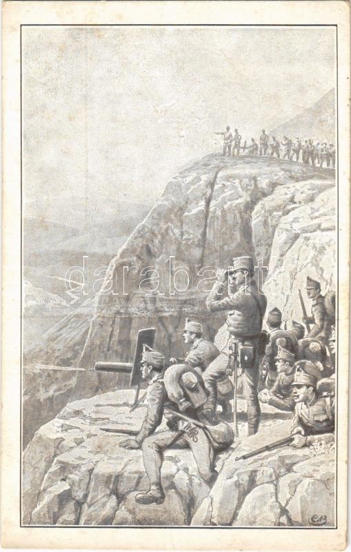 Die Hand ist stark, fest ist der Blick... A. M. Vállas / WWI Austro-Hungarian K.u.K. military art postcard, machine gun, mountain troops (fl)