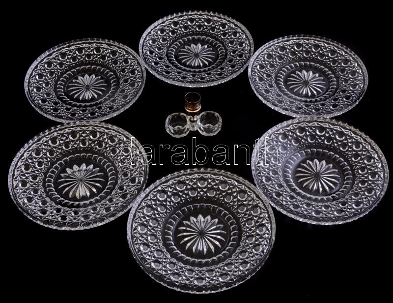 Ezüst (Ag.) tetejű fűszertartó, metszett üveggel, apró kopásnyomokkal, jelzés nélkül, m: 6,5 cm, h: 16,5 cm, br. 76 g + 6 db üveg tányér, apró kopásnyomokkal, d: 18 cm