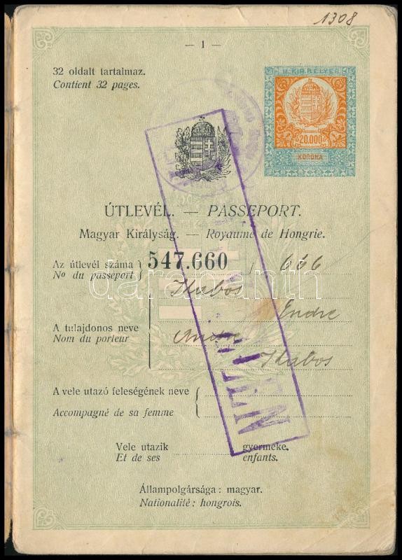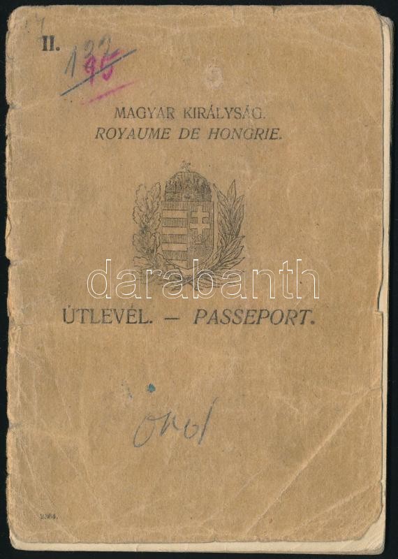 1927 Bp., Magyar Királyság által kiállított útlevél Kabos Endre (1906-... https://www.darabanth.com/en/388-Online-auction/388.0/Art-and-other-collectibles/Documents~500018/1927-Bp-Magyar-Kiralysag-altal-kiallitott-utlevel-Kabos-Endre-1906-1944-vivo-szamara-~II2327826