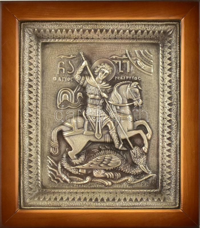 Sárkányölő Szent György modern grúz/orosz fém ikon üvegezett keretben. Parshin Alexander. 24x28 cm
