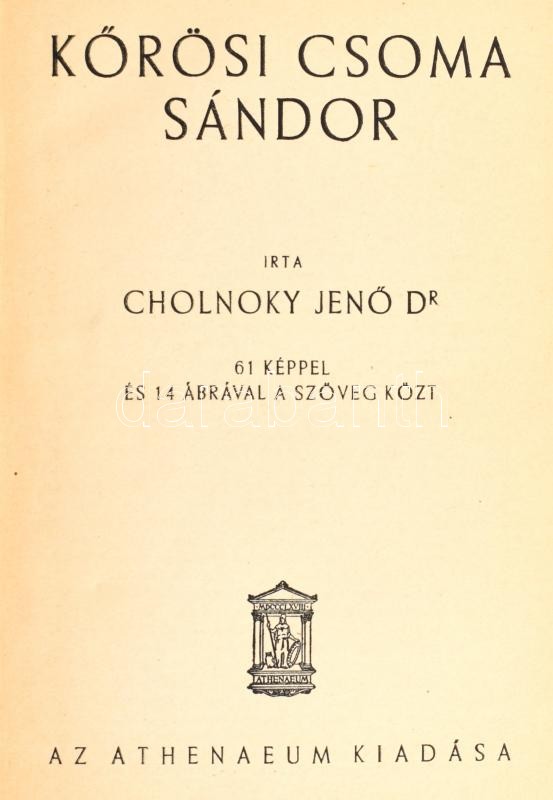 Cholnoky Jenő: Kőrösi Csoma Sándor. Bp., é.n., Athenaeum. 61 képpel és...