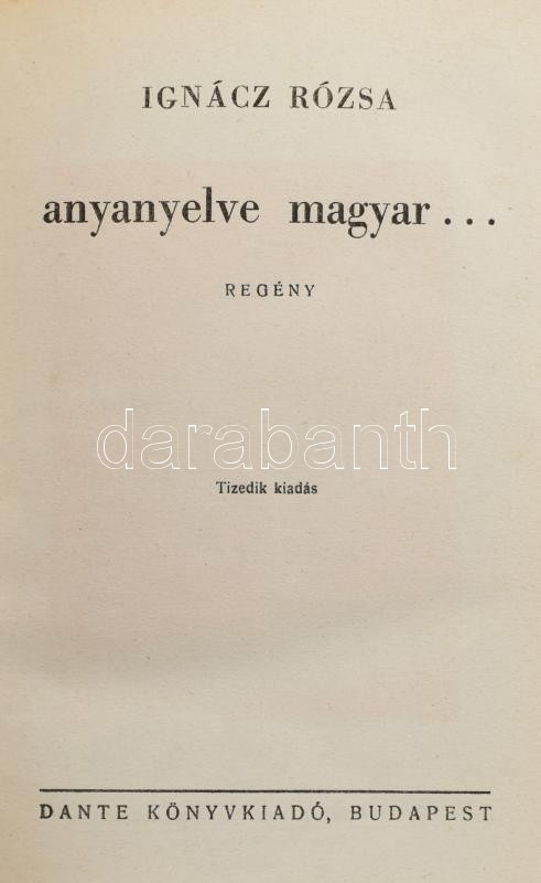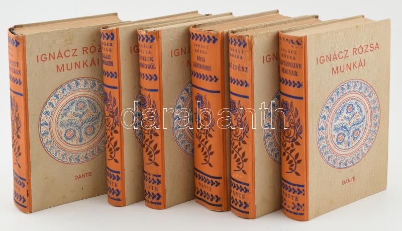 Ignácz Rózsa munkái sorozat 6 kötete: Anyanyelve magyar..., Született Moldovában, Családi mondakör, Levelek Erdélyből, Róza leányasszony, Rézpénz. Bp.,1941-1943-én., Dante. Kiadói félvászon-kötés, kissé kopott borítókkal és gerincekkel. Az "Anyanyelve magyar" c. kötetben a szerzőt Ignácz Rózsát (1909-1979) ábrázoló címképpel, alatta nyomtatott (!) dedikációval.