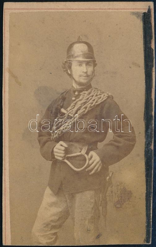 1874 Tűzoltó fotója, keményhátú fotó Exner Gyula műterméből, vágott ka...